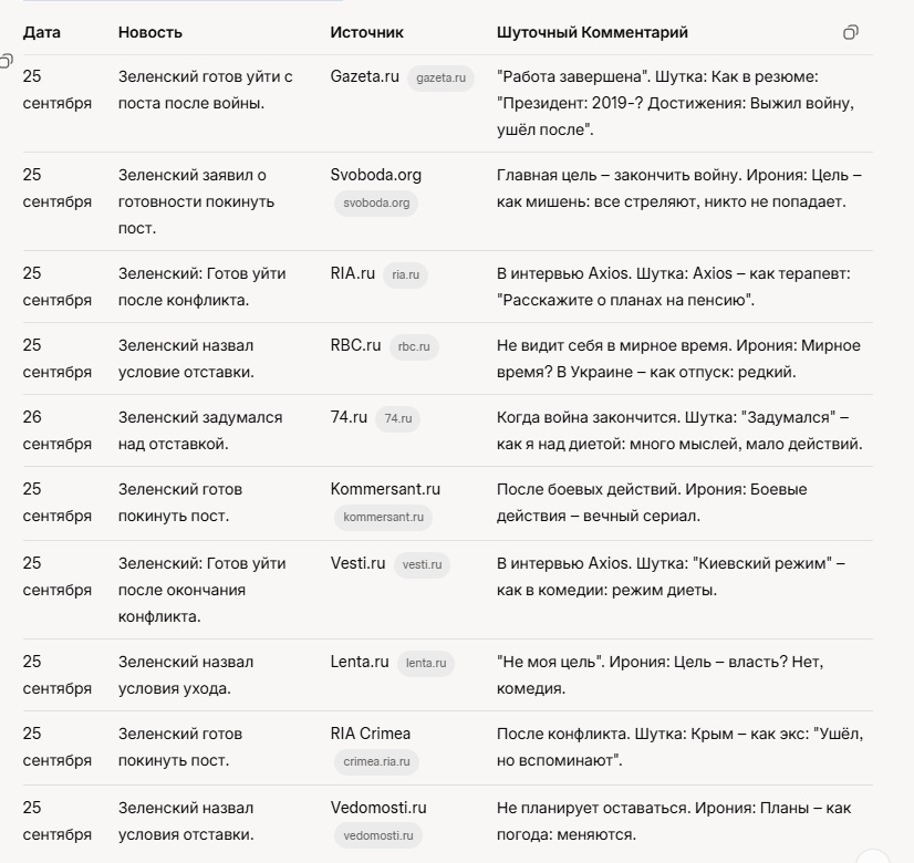 Тренд: Зеленский использует СМИ для противопоставления российской агрессии, отмечая отказ Москвы от мира (13 сентября), что усиливает призывы к Китаю и Западу. Однако риски эскалации остаются, с фокусом на Трампе как потенциальном посреднике, но с предупреждениями об обмане Путина. В целом, месяц показывает Зеленского как решительного лидера, балансирующего между обороной и дипломатией, с потенциалом для прорыва в санкциях, но с рисками затяжного конфликта.