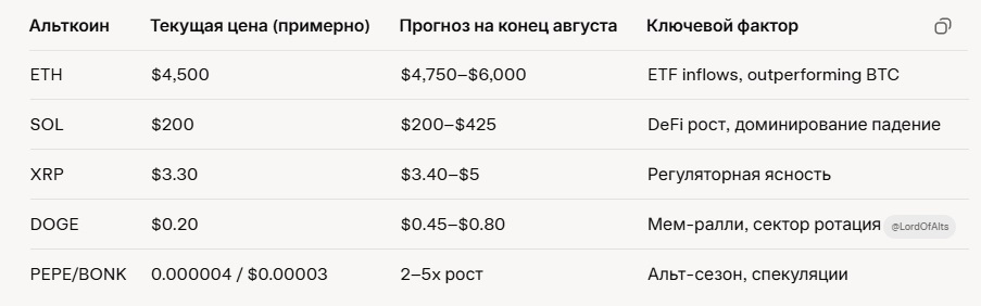 На основе анализа текущих данных на 16 августа 2025 года, Bitcoin торгуется в диапазоне около $117,000–$122,000, с недавним новым ATH (all-time high) в июле на уровне $124,533. Большинство прогнозов указывают на умеренный рост или консолидацию в оставшейся части августа, с потенциалом прорыва вверх благодаря институциональным вливам (ETF inflows), снижению доминирования BTC (до 59%) и ожиданиям снижения ставок ФРС.