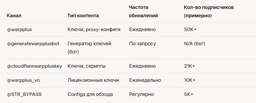 Списки Telegram-каналов с генераторами конфигов и ключей для Cloudflare Warp+.
