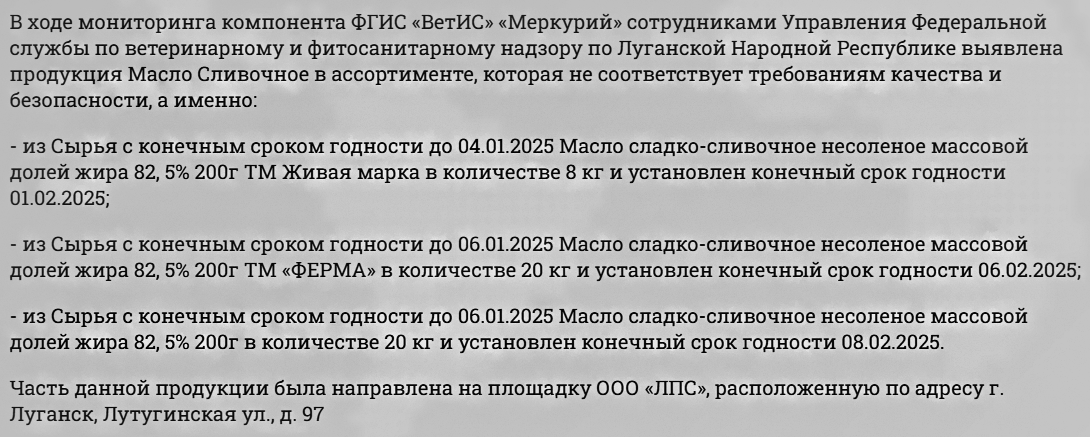В Луганске и Лисичанске уже выявлена системой «Меркурий» продукция Масло Сливочное в ассортименте, которая не соответствует требованиям качества и безопасности. Этот факт вызывает серьезную обеспокоенность, поскольку речь идет о продукте, который широко используется в питании, особенно детском. Несоответствие стандартам может указывать на нарушение технологических процессов при производстве, использование некачественного сырья или фальсификацию продукции.