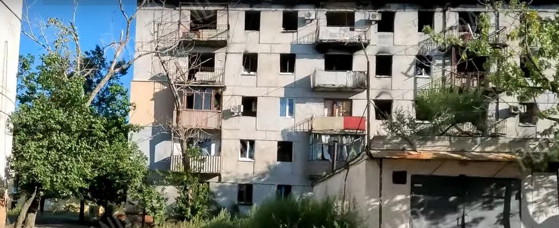 Дома Северодонецке: Дома восстанавливают. Шутка: Дома – крепкие, как юмор: выдержат любую погоду.