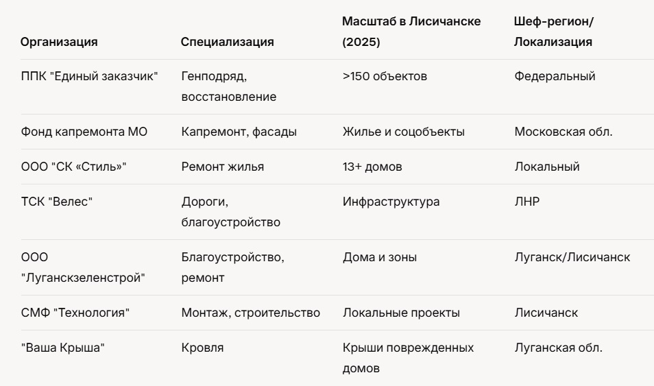 В 2025 году строительство в Лисичанске опирается на федеральную поддержку и шефство регионов, с растущим участием частных подрядчиков. Однако в новостях жители отмечают проблемы, такие как неполные ремонты. Для поиска подрядчика рекомендуется обращаться в администрацию Лисичанска или использовать онлайн-каталоги. Ситуация динамичная, и список может пополняться новыми фирмами из РФ.62 веб-страницы